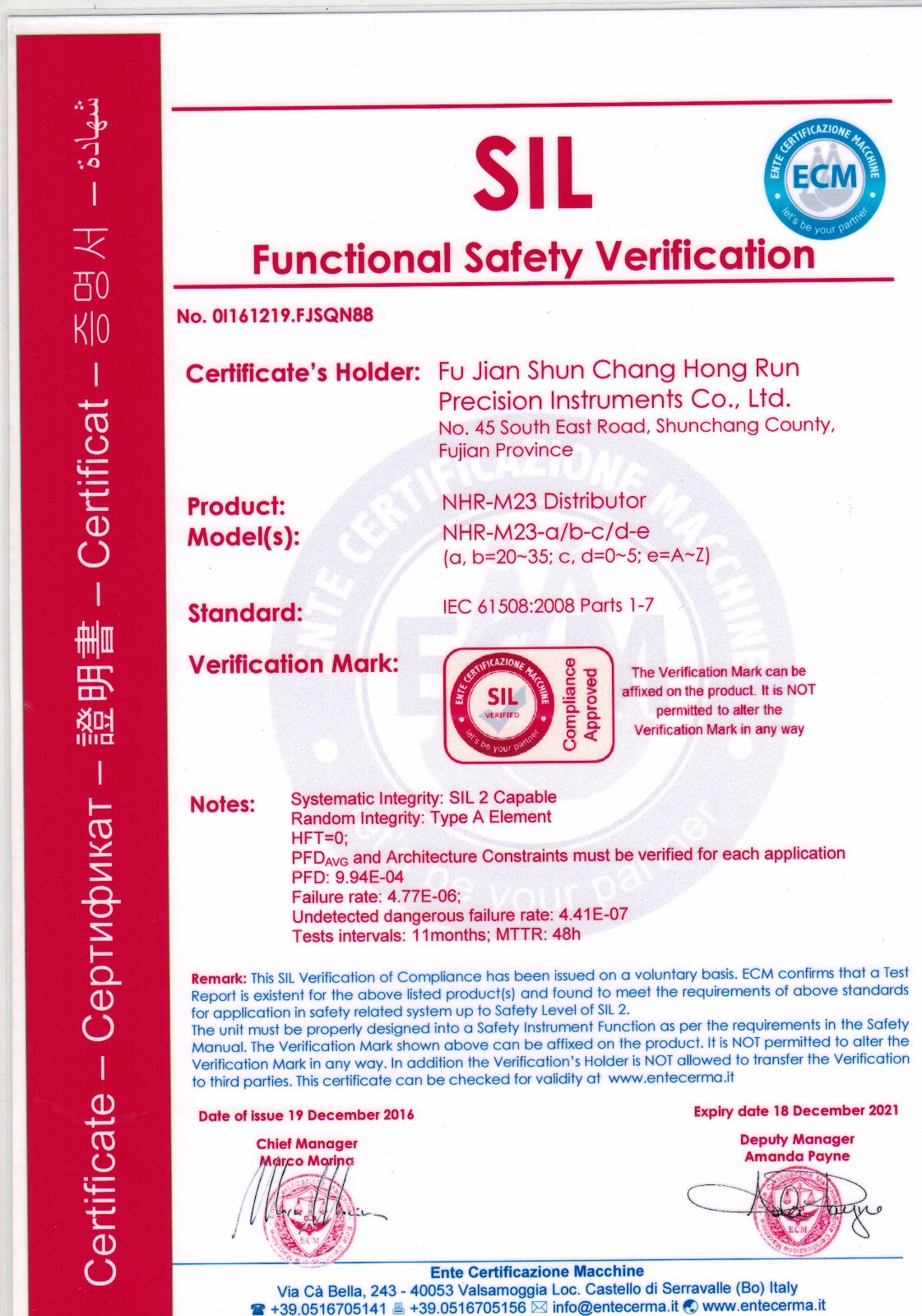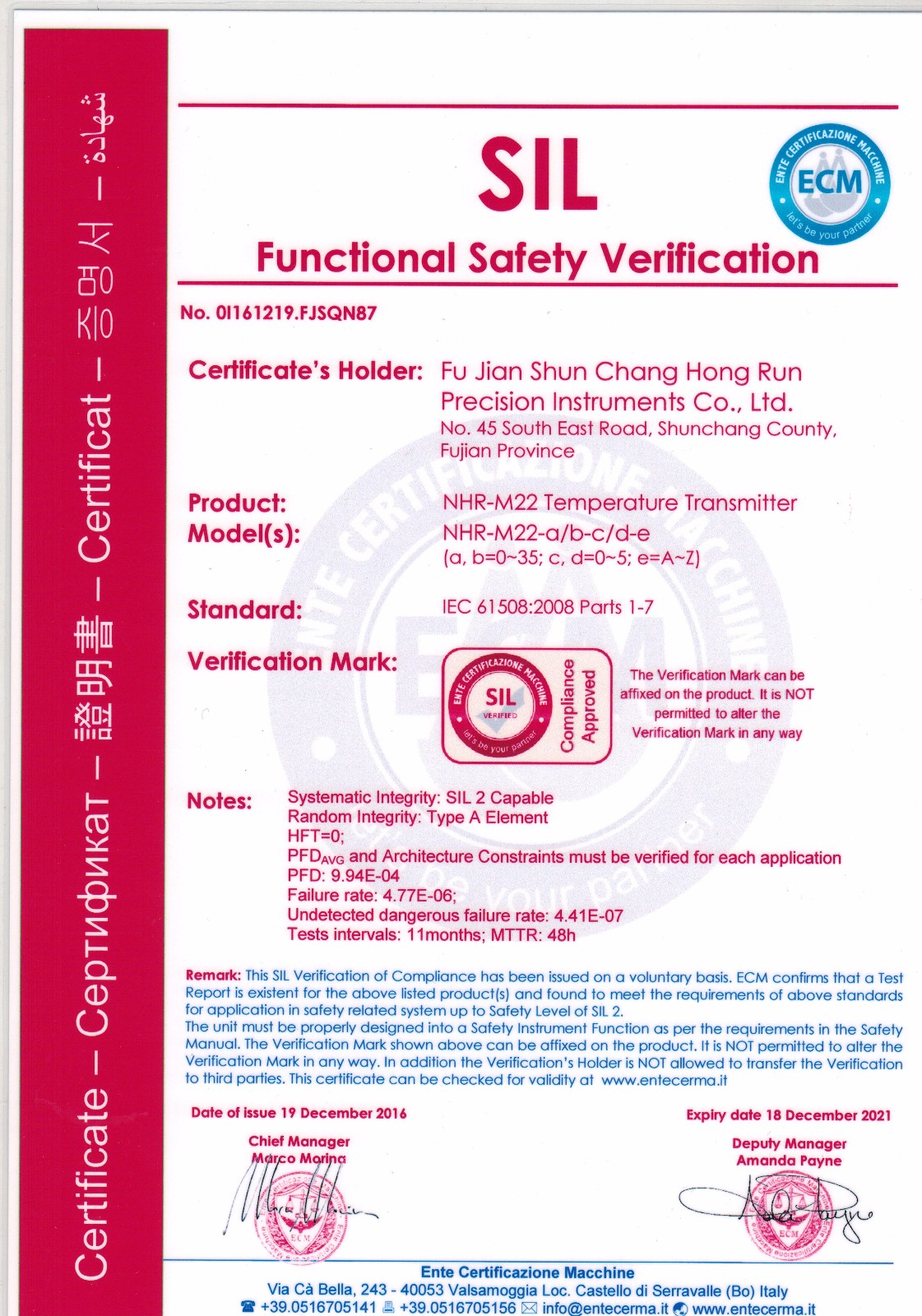 近日,虹潤(rùn)智能儀表系列產(chǎn)品再傳喜訊,虹潤(rùn)兩款智能儀表產(chǎn)品NHR-M22溫度變送器、NHR-M23配電器獲得了國(guó)際SIL2功能安全認(rèn)證證書。這標(biāo)志著虹潤(rùn)儀表產(chǎn)品的安全性達(dá)到了國(guó)際標(biāo)準(zhǔn)。也為虹潤(rùn)產(chǎn)品實(shí)現(xiàn)走向世界的美好愿景再一次打下了堅(jiān)實(shí)的硬件基礎(chǔ)。