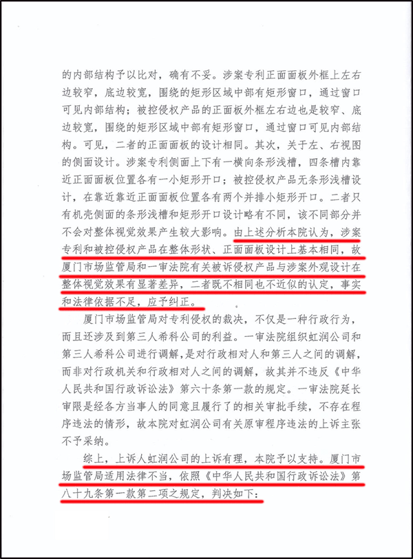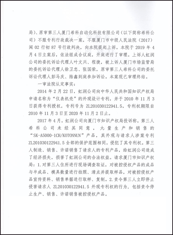2015年9月福建順昌虹潤精密儀器有限公司(以下簡稱虹潤公司)在市場上發(fā)現(xiàn)廈門??谱詣?dòng)化科技有限公司(以下簡稱??乒荆┪唇?jīng)虹潤公司同意,大量生產(chǎn)和銷售仿冒虹潤NHR-8000系列無紙記錄儀的侵權(quán)產(chǎn)品??艫5000、A6000無紙記錄儀。侵犯了虹潤公司的知識(shí)產(chǎn)權(quán)。虹潤公司于2016年先發(fā)函告知??乒局兄骨謾?quán)行為,但??乒静挥枥頃?huì)。為了維護(hù)自身的合法權(quán)益,虹潤公司又向廈門市市場監(jiān)督管理局(原廈門市知識(shí)產(chǎn)權(quán)局)申請行政處理,后再提起行政訴訟。2019年7月30日,福建省高級(jí)人民法院作出【2019】閩行終302號(hào)行政判決書,認(rèn)定??乒旧a(chǎn)的產(chǎn)品與我司的“儀表機(jī)殼”外觀設(shè)計(jì)專利整體形狀、正面面板設(shè)計(jì)上基本相同。至此,虹潤公司歷時(shí)四年的維權(quán)行為得到了法律支持,福建省高院終審認(rèn)定廈門??茻o紙記錄儀專利侵權(quán)。