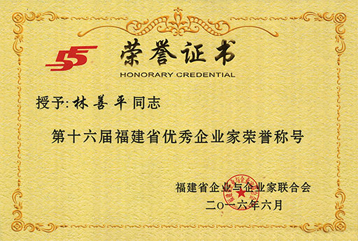 為弘揚優(yōu)秀企業(yè)家深化改革、科學(xué)管理、與時俱進(jìn)、勇于創(chuàng)新的開拓精神,激勵廣大企業(yè)家敢為天下先、愛拼才會贏的闖勁,為推動福建省產(chǎn)業(yè)轉(zhuǎn)型升級和經(jīng)濟(jì)持續(xù)健康發(fā)展建功立業(yè),近日,福建省企業(yè)與企業(yè)家聯(lián)合會組織開展了每兩年評選一次的福建省優(yōu)秀企業(yè)家評選工作,并于2016年6月24日決定授予98位企業(yè)經(jīng)營管理者“第十六屆福建省優(yōu)秀企業(yè)家”榮譽(yù)稱號,虹潤公司董事長林善平榮獲該榮譽(yù)稱號。