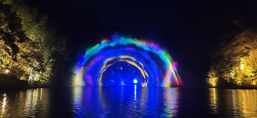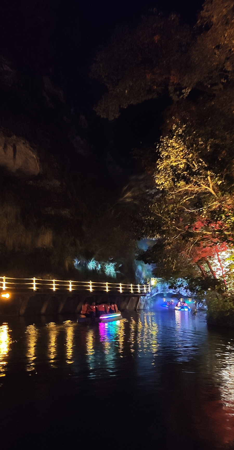 入夜,黨支部一行來到本次文旅最精彩的項目:“夜游九龍?zhí)?rdquo;。以“夜游九龍?zhí)?,靜享夜的美”為主題的“行進(jìn)式”水上峽谷夜游景區(qū),利用現(xiàn)代化聲光技術(shù)與景區(qū)自然美景有機(jī)融合,讓您充分感受“詩意山水,光影幻境”。聽蛙唱蟲奏,觀月下仙境,月光映水,水波映月,加上臨水棧道邊笛聲陣陣......讓您真切的領(lǐng)會空靈、幽靜、夢幻的別樣意境。一路的聲光風(fēng)景讓人目不暇接,如果不是身臨其境,絕對感受不到那光影與大自然結(jié)合產(chǎn)生的絕妙意境。